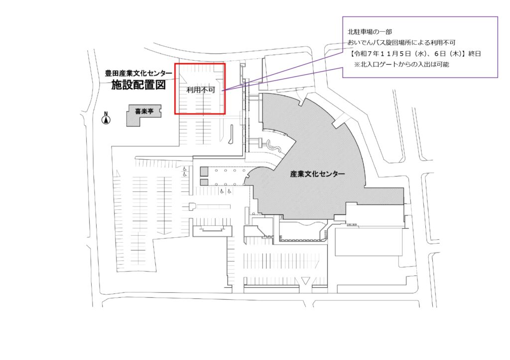 11/5・6の終日、ラリージャパンの開催に伴い、産業文化センター北駐車場がおいでんバスの旋回場所になるため一部が利用できなくなります。