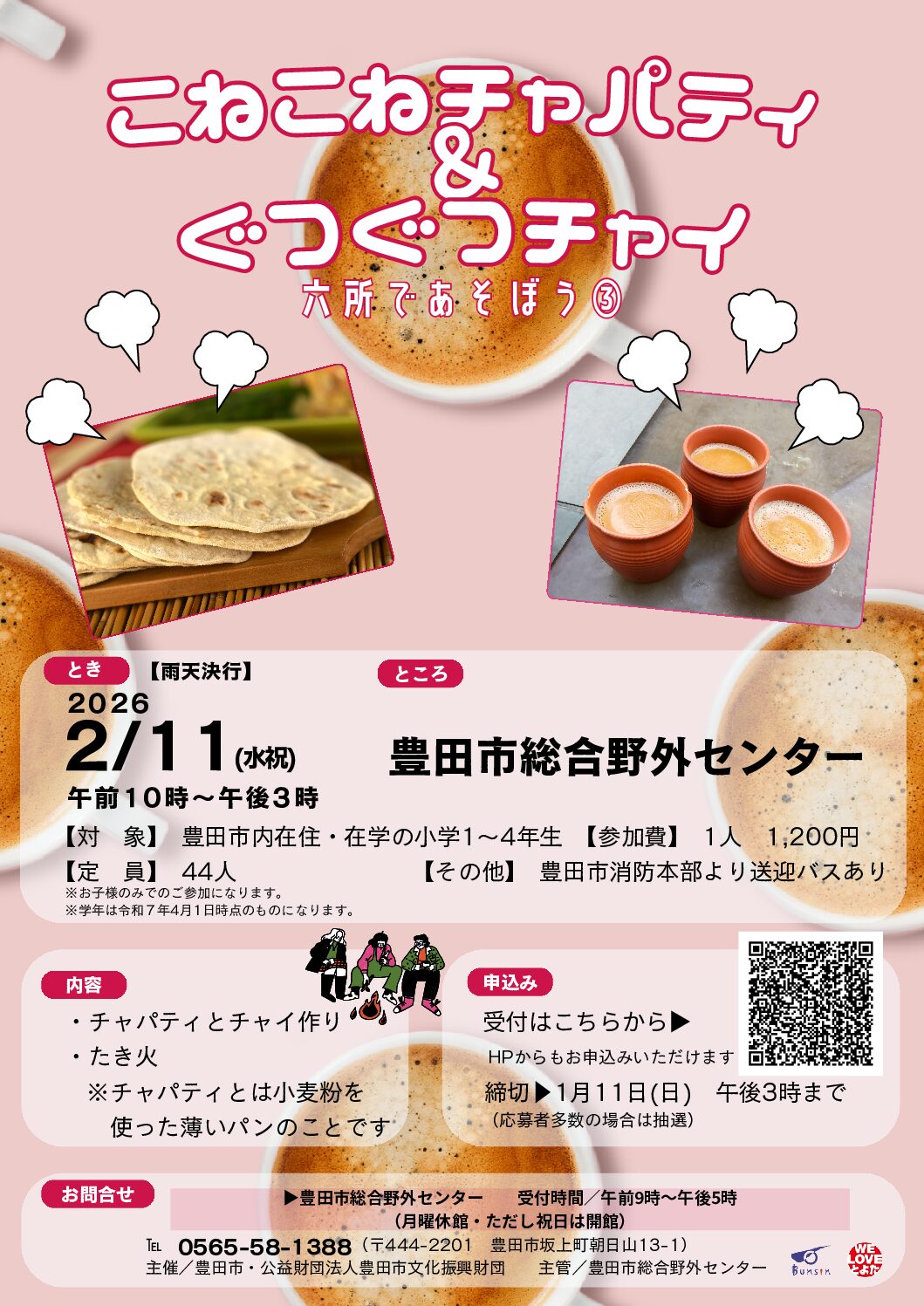 キャンプ,体験,参加する■と き 令和8年2月11日(水祝)午前10時~午後3時 ■内 容 チャパティ、チャイ作り、たき火 ※チャパティとは小麦粉を使った薄いパンのことです ■対 象 豊田市内在住・在学の、小学1~4年生 ■定 員 抽選44名 […]