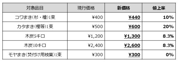 令和8年4月1日(水)利用分より、まき、木炭の販売価格を改定させていただくこととなりました。適正価格への見直しを行い、より安定した運営体制のもと、今後も高品質で安定した商品の提供に努めてまいります。