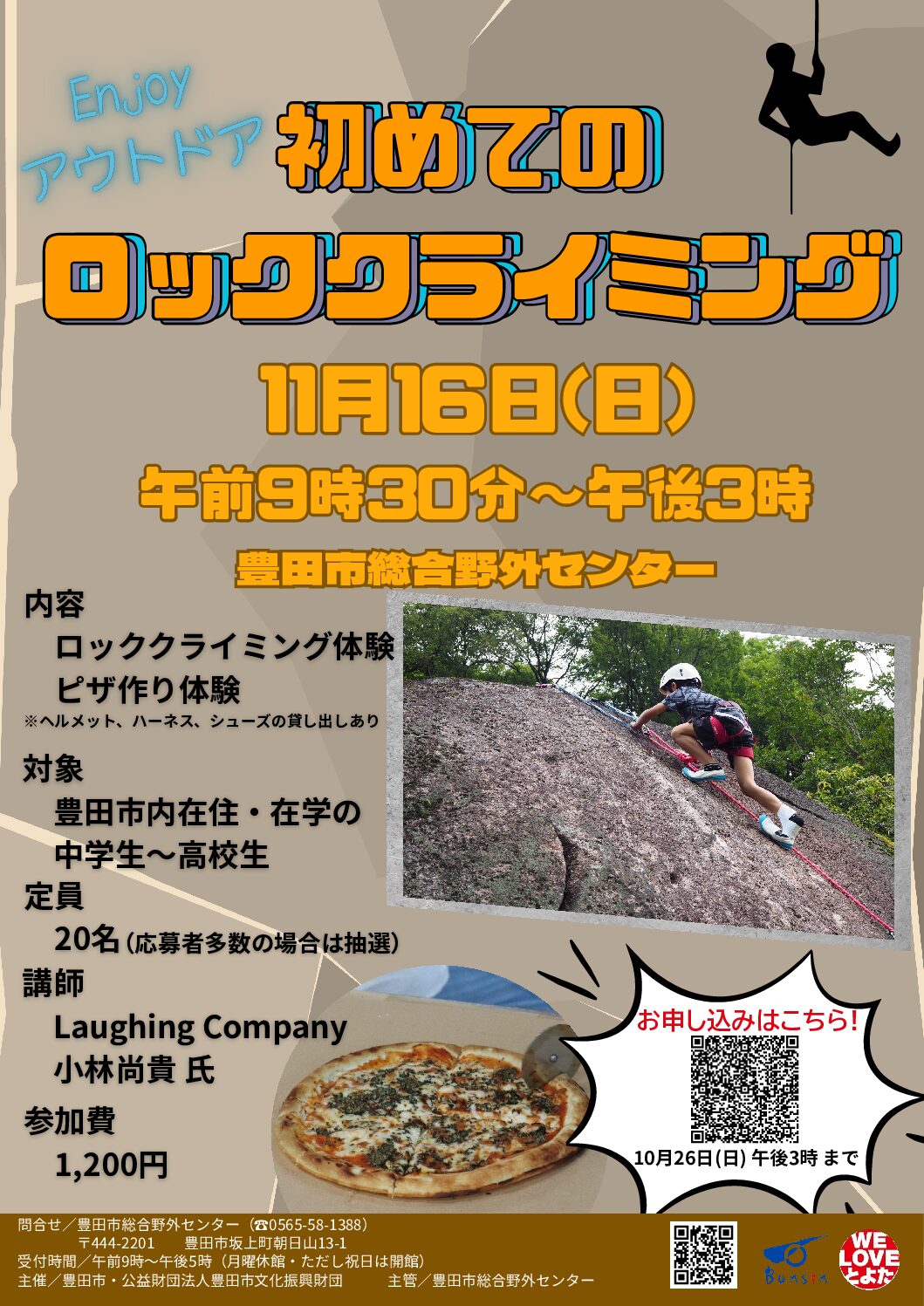 「はじめてのロッククライミング」キャンプ■と き 令和7年11月16日(日)午前10時~午後3時 ■内 容 ロッククライミング、ピザ作り体験 ■対 象 豊田市内在住・在学の、中学生~高校生 ■定 員 抽選20名 ■参加費 1,200円 ■申込み 10月26日( […]
