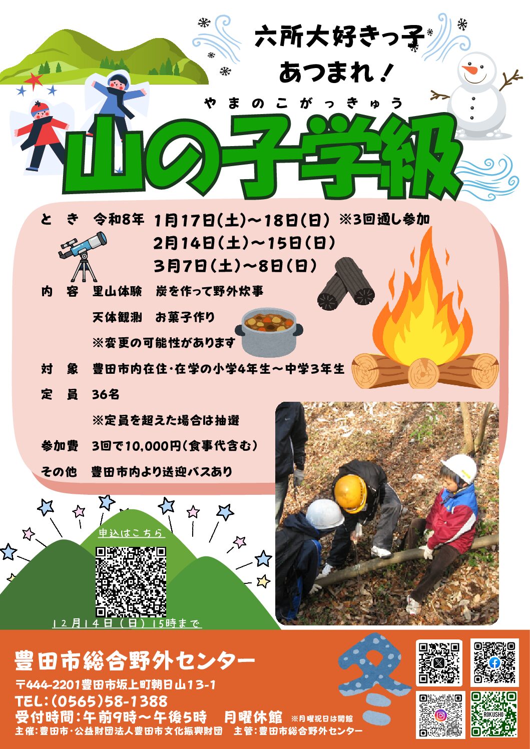 ■と き 令和8年 ※3回通し参加 1回目 1月17日(土)~18日(日) 2回目 2月14日(土)~15日(日) 3回目 3月7日(土)~8日(日) ■内 容 里山体験 炭を作って野外炊事 […]